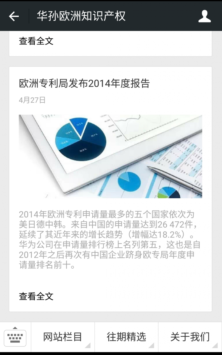 除了向订阅用户推送欧洲知识产权业界资讯和实务知识之外,华孙欧洲知识产权公众号界面(如下图所示)还为您提供了丰富的外部链接和按内容划分的往期资讯精选:
