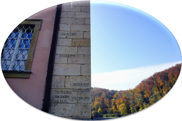 漫步在古朴的街道上,我们发现许多古老的建筑上都刻有数字。我们的德国同事介绍道,在德国,一般建于河边的城镇都会有类似的刻印,上面的数据指向年份以及当年对应的水位情况。
